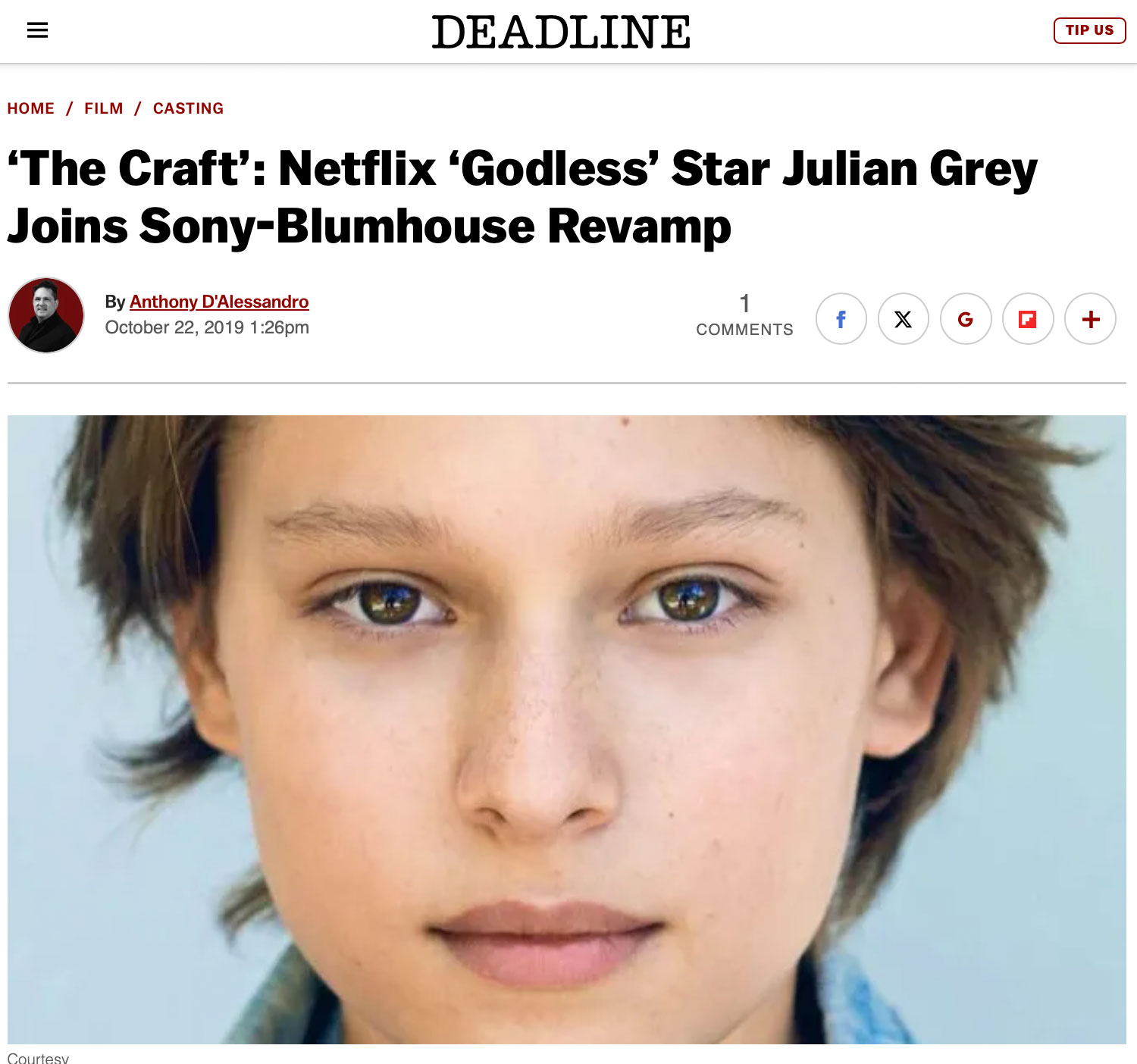 Originally published on Deadline, October 22, 2019 by Anthony D’Allessandro EXCLUSIVE: Julian Grey has boarded Sony/Blumhouse/Red Wagon’s reboot of 1990s femme witchcraft pic The Craft which Zoe Lister-Jones is writing, directing and exec producing. A native Angelino, Grey recently wrapped his first feature film playing the fearless son of Will Ferrell and Julia Louis-Dreyfus in Fox Searchlight’s Downhill,...